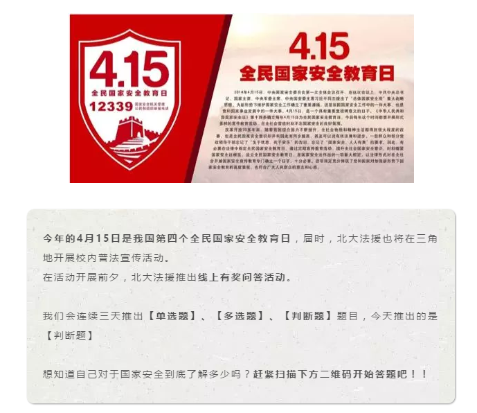 12日—14日,法律援助协会连续三天在协会微信公众号和英国威廉希尔英文官网团委微信公众号上发布“4·15”全民国家安全教育日线上有奖竞答问卷。问卷由协会志愿者们精心挑选题目、耐心编写解答,旨在通过单项选择、多项选择、判断等不同形式的答题锻炼,帮助答题者将国家安全法律知识内化于心。线上有奖问答形式得到了师生们的参与和转发,受到广泛好评。协会亦通过分析师生答题情况,设计更贴合大家需求实际的普法宣传材料。