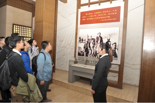 在讲解员的带领下,同学们首先参观了内分为12个展厅的陈列展览馆。走近序厅,迎面是一座巨大的群像石雕,历史的序幕由此缓缓拉开:1947年5月,中央工委进驻西柏坡;同年,全国土地会议在西柏坡召开;1948年党中央、毛主席移驻西柏坡,指挥震惊中外的三大战役;1949年,具有历史转折意义的七届二中全会在此召开……在讲解员的娓娓道来中,同学们加深了对见证新中国成立的这一方红色土地的认识和了解。