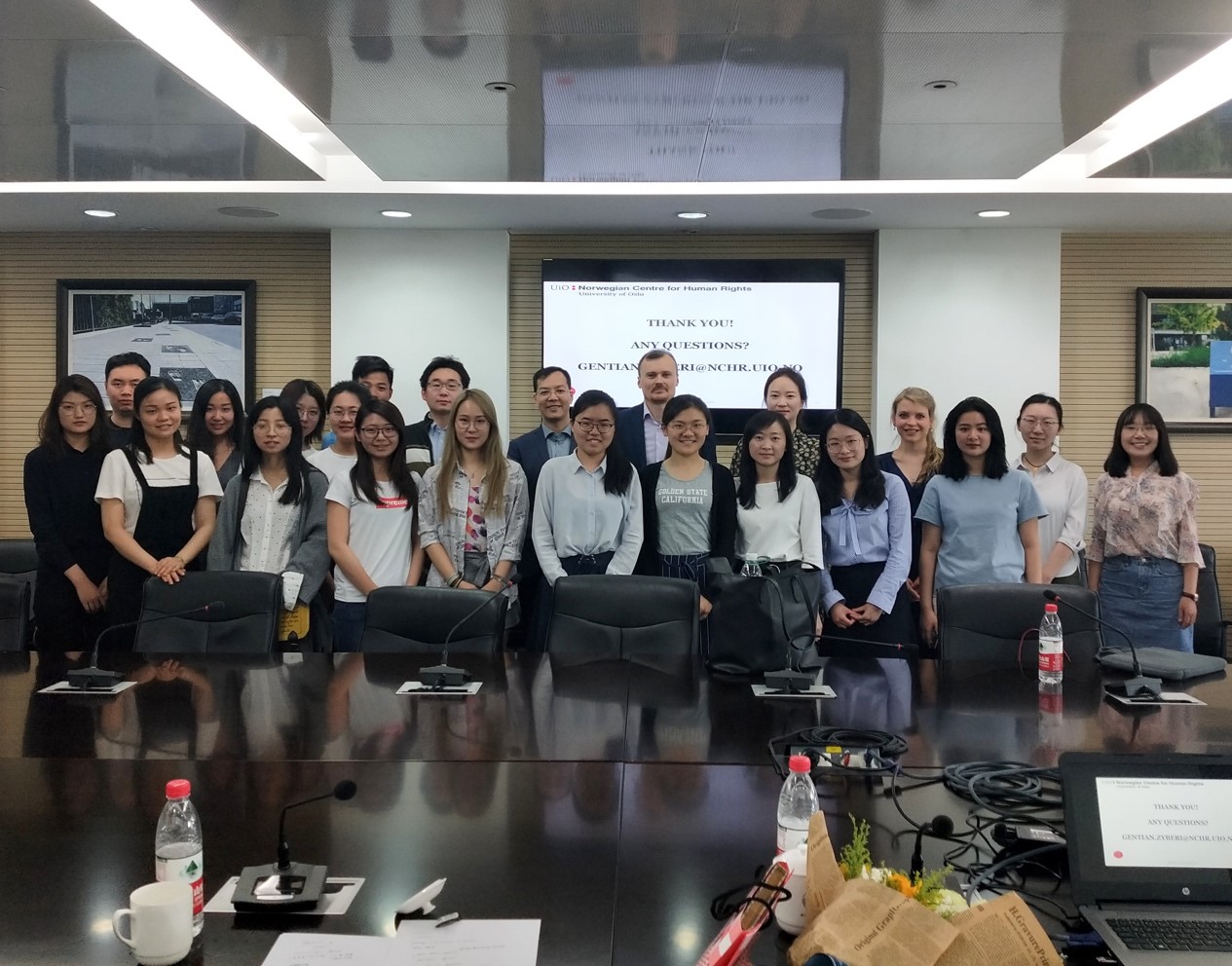 讲座的后半程为前来聆听的同学们提供了充分的提问机会。Zyberi教授针对“控制”概念的模糊、“指挥”(direction)与“控制”的含义区分、危害人类罪的构成要件以及反措施的使用条件等问题逐一进行了解答。讲座结束后,Zyberi教授与参与本次讲座的老师及同学们合影留念。