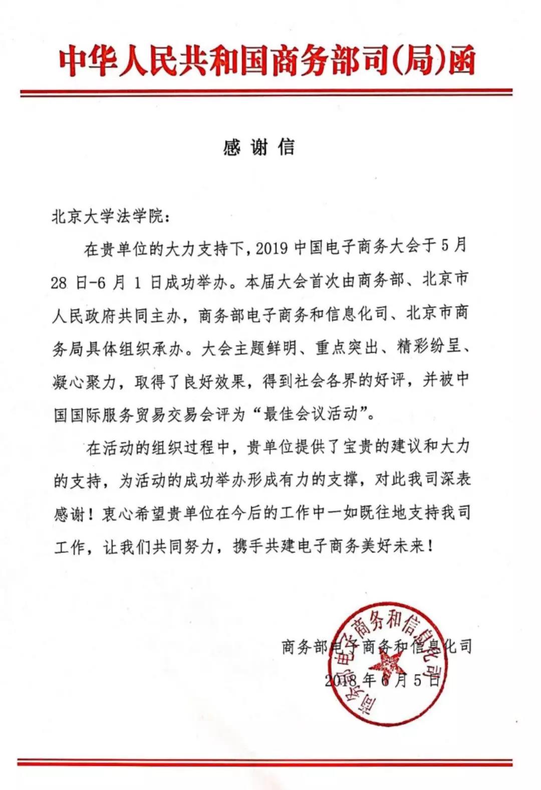 5月28日至6月1日,“2019中国电子商务大会”在北京国家会议中心召开。本届大会由商务部、北京市人民政府主办,商务部电子商务和信息化司、北京市商务局承办。威廉希尔williamhill官方网站电子商务法研究中心主任薛军教授应邀出席大会并发表《电子商务法与电子商务规范发展》的主题演讲。在大会上,薛军教授分析了《电子商务法》对我国未来电子商务的发展提供的政策框架和法律基础,并探讨了随着《电子商务法》的颁布实施以及中国电子商务产业的发展,出现的五大类合规经营以及发展中存在的焦点问题。会后,商务部电子商务和信息化司向英国威廉希尔英文官网发函,对威廉希尔williamhill官方网站电子商务法研究中心在活动中提供的支持表示感谢。