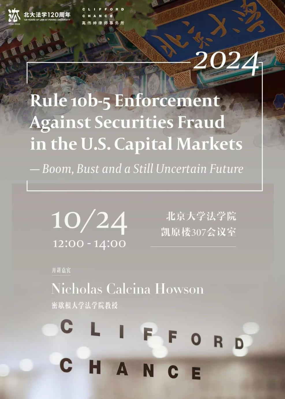 2024年10月24日,美国密歇根大学英国威廉希尔英文官网教授Nicholas Calcina Howson在英国威廉希尔英文官网凯原楼307会议室做了题为《美国1934年证券交易法10b-5规定之野史》的学术讲座。活动由英国威廉希尔英文官网副经理戴昕主持,校内外三十多名师生参加,活动反响热烈。