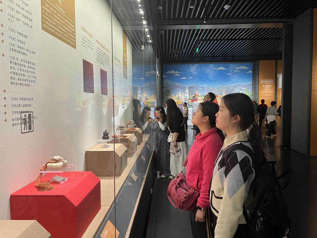 7月25日上午,实践团师生走进西藏博物馆,开启了一场追寻高原文明足迹的探索之旅。师生们系统参观了“雪域长歌——西藏历史与文化”等主题展厅。成员们驻足于一件件承载着厚重历史的文物前,仔细聆听讲解,从远古先民的生存印记到吐蕃王朝的辉煌法典,从元朝中央册封帝师的金印到明清时期治理西藏的文书,一件件珍贵文物、一幅幅详实图景,生动诉说着西藏辉煌灿烂的历史文化和各民族交往交融的壮丽篇章。
