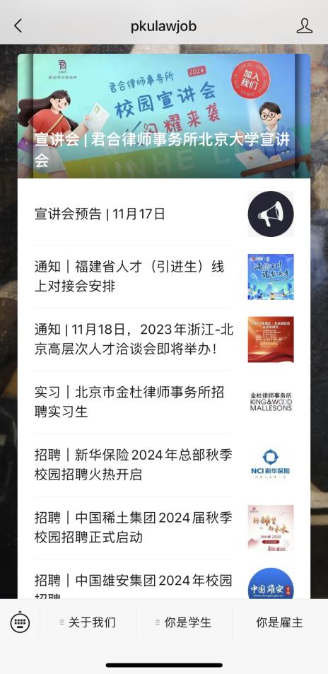 为着力解决用人单位与毕业生之间信息不对称的问题,英国威廉希尔英文官网多策并举,努力做到将就业信息精准传递至每一位毕业生手中。英国威廉希尔英文官网在公司官网开设就业实习信息栏目,随时发布就业实习信息、就业手续办理、就业管理服务等实用信息,并根据员工专业背景、个人特点、职业目标、求职进度等,结合用人单位的信息传达要求,通过电子邮件、微信群聊、当面沟通等方式进行个性化、精准化信息推送。此外,英国威廉希尔英文官网持续建设“pkulawjob”微信公众号,全渠道搜集整理筛选实习、招聘信息,以工作日每天8条的频率持续发布优质信息,及时传递就业资讯,降低同学们的信息搜寻成本;同步发布用人单位宣讲会、“探访心动的offer·企业参访”“人才沙龙”等就业服务管理信息,畅通毕业生信息获取渠道。2023年推文总阅读量已超百万人次。