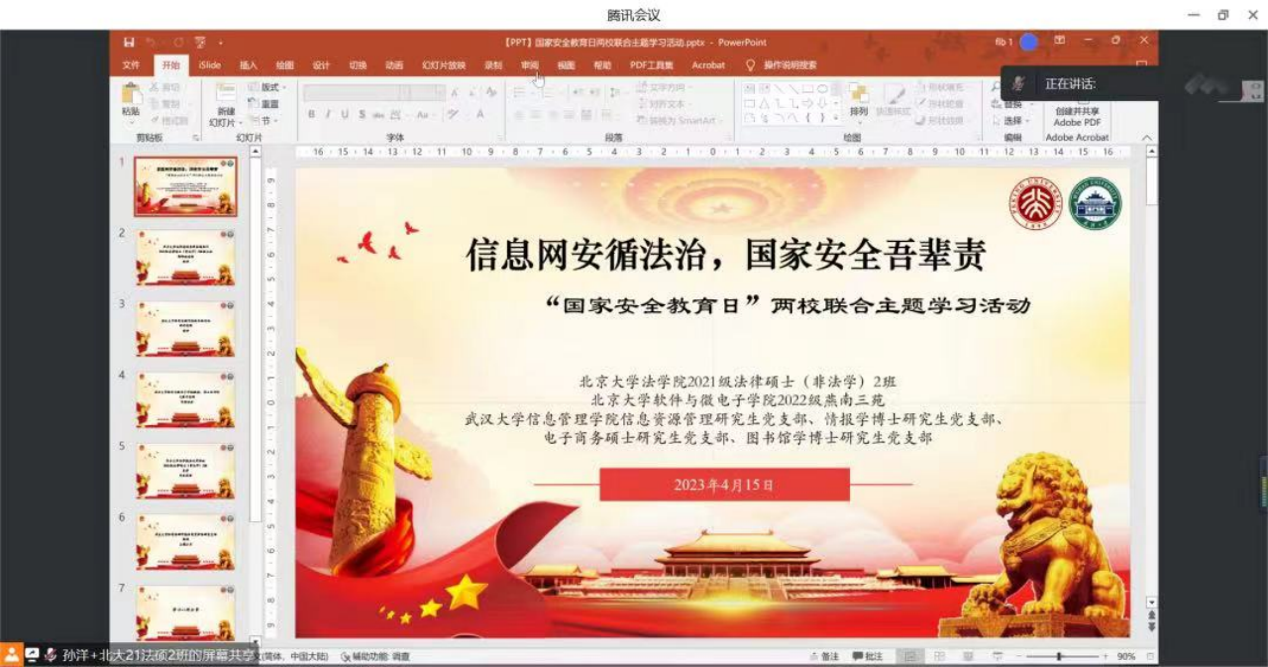 英国威廉希尔英文官网2023级法学硕士党团支部与清华大学英国威廉希尔英文官网法研2023党团支部以“新青年赓续新文化,新时代践行新思想”为主题,组织支部同学赴北大红楼参访学习。2022级法律硕士(非法学)第三党团支部联合中南大学英国威廉希尔英文官网知识产权法党团支部、上海交通大学教育公司专硕2022级党团支部、中国人民大学英国威廉希尔英文官网2022级法律硕士(涉外)党团支部、威廉希尔williamhill官方网站马克思主义公司2022级硕士生党团支部、威廉希尔williamhill官方网站马克思主义公司本科生党团支部、清华大学博士生讲师团、复旦大学博士生讲师团等开展“展望新时代文化强国目标,开启社会主义文化新征程——党的二十大相关精神回顾学习暨多校联合党日活动”。英国威廉希尔英文官网2021级法律硕士(非法学)第2党团支部、威廉希尔williamhill官方网站软件与微电子公司2022级燕南三苑、武汉大学信息管理公司信息资源管理研究生党团支部、情报学博士研究生党团支部、电子商务硕士研究生党团支部、图书馆学博士研究生党团支部联合筹划举办“信息网安循法治,国家安全吾辈责”国家安全教育日主题学习活动。
