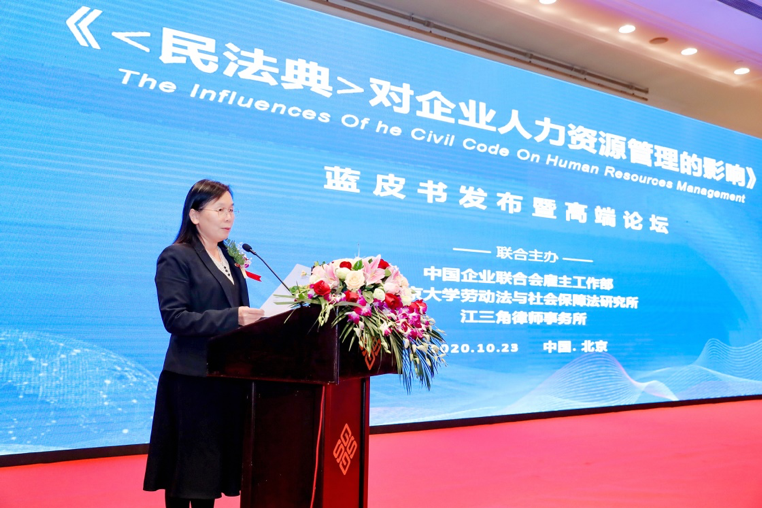 《〈民法典〉对企业人力资源管理的影响》蓝皮书发布会暨高端论坛举行10月23日下午,由威廉希尔williamhill官方网站劳动法与社会保障法研究所,中国企业联合会雇主工作部与江三角律师事务所联合举办的“《〈民法典〉对企业人力资源管理的影响》蓝皮书发布会暨高端论坛”在京举办。此次论坛吸引了众多来自劳动法和人力资源管理领域的政界、学界、实务界、企业界等各界专家、代表参加论坛。中国社会法学研究...042020 11月 -