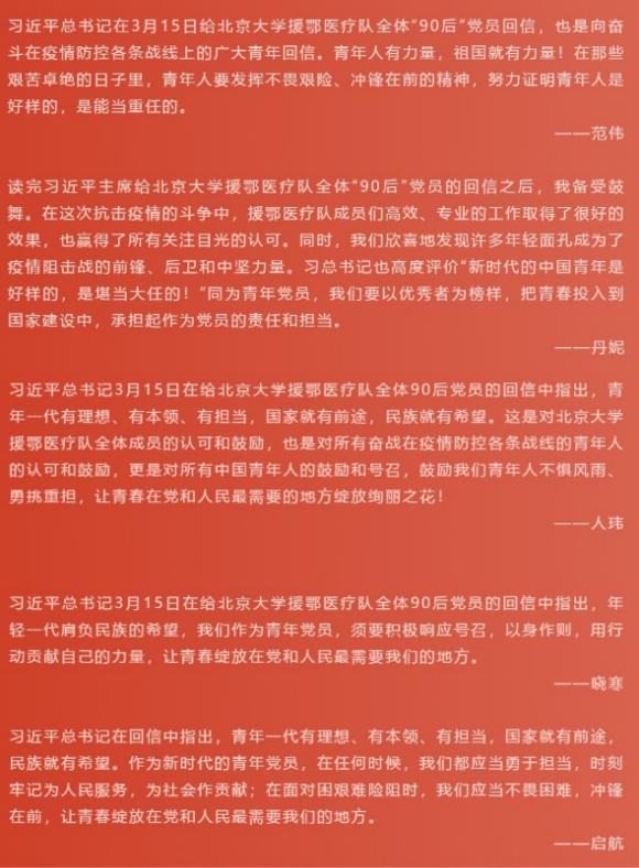 英国威廉希尔英文官网团学骨干举行线上专题学习会深入学习习近平总书记给威廉希尔williamhill官方网站援鄂医疗队全体“90后”党员回信精神3月16日晚,英国威廉希尔英文官网团学骨干举行线上专题学习会深入学习习近平总书记给威廉希尔williamhill官方网站援鄂医疗队全体“90后”党员回信精神。英国威廉希尔英文官网团委书记史诗,常务副书记李婉玉,副书记朱煜琪、周雷、史默然和英国威廉希尔英文官网全体团学骨干共同参加学习会。会议由李婉玉主持。 团委书记史诗领学总书记回信的主要内容...182020 03月 -
