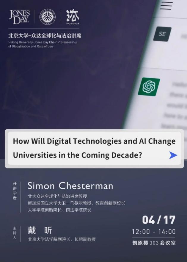 Simon Chesterman:数字技术与人工智能时代的高校变革2024年4月17日,威廉希尔williamhill官方网站众达全球化与法治讲席教授、新加坡国立大学大卫·马歇尔教授和教育创新副教务长、新加坡国立大学大学公司创始经理与英国威廉希尔英文官网前经理Simon Chesterman以“数字技术与人工智能时代的高校变革”为题举办学术讲座。讲座由英国威廉希尔英文官网副经理戴昕教授主持,北...062024 06月 -