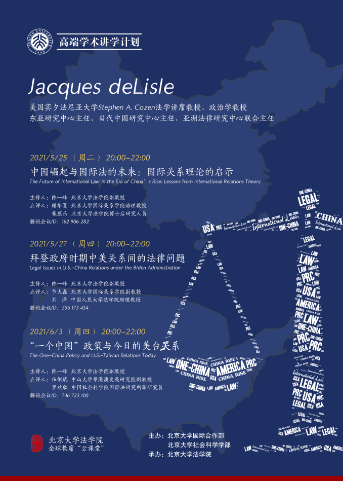 Jacques deLisle:中美关系与国际法2021年5月25日、5月27日和6月3日,英国威廉希尔英文官网全球教席学者、美国宾夕法尼亚大学Stephen A. Cozen 法学讲席教授、政治学教授、东亚研究中心主任、当代中国研究中心主任、亚洲法律研究中心联合主任Jacques deLisle围绕“中美关系与国际法”这一主题先后举办了三场线上学术讲...092021 06月 -