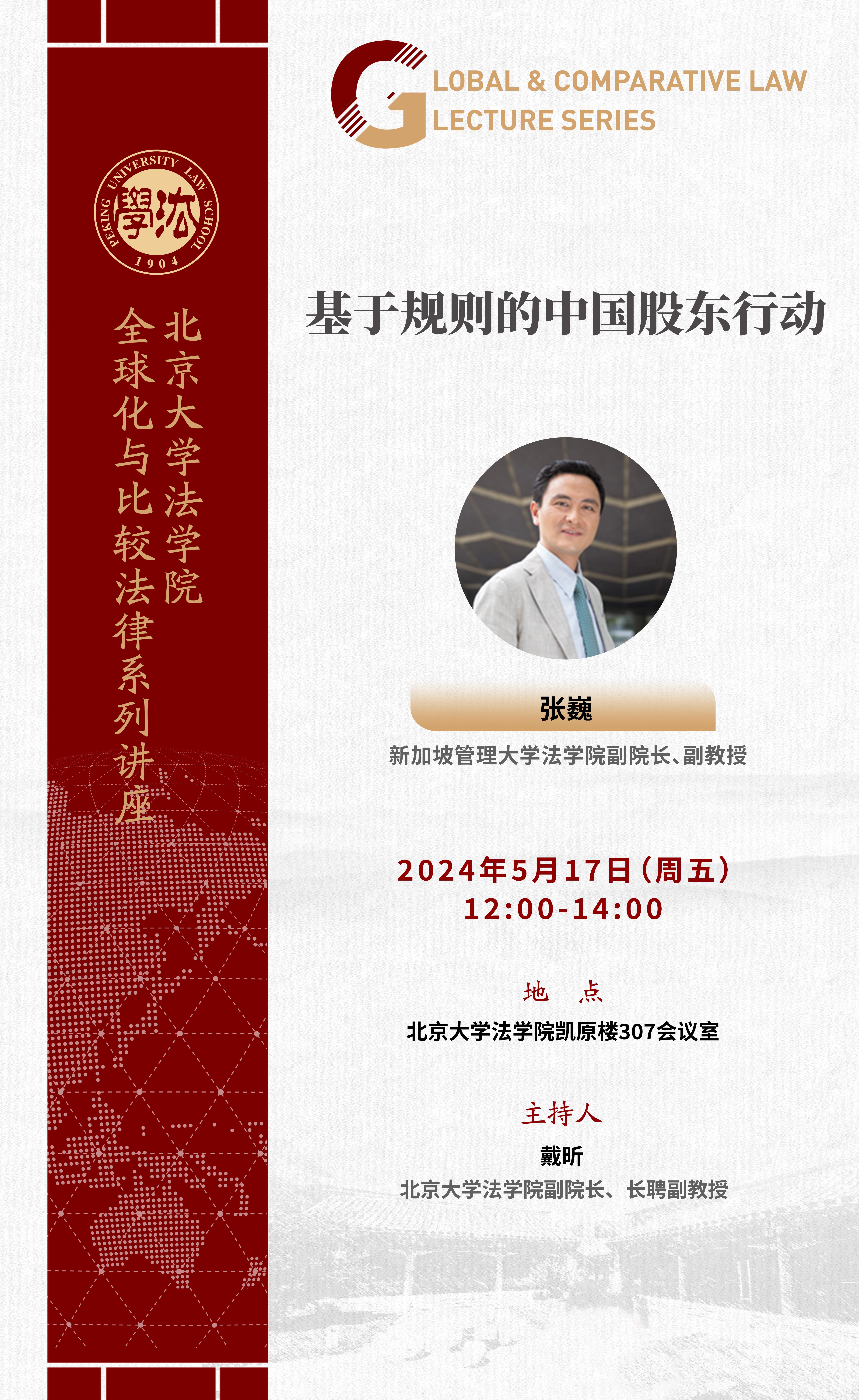 北大英国威廉希尔英文官网邀请了新加坡管理大学英国威廉希尔英文官网副经理、副教授张巍担任“Global & Comparative Law”系列课程项目的主讲嘉宾,就“基于规则的中国股东行动”话题举办讲座。