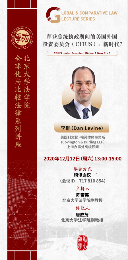 2020年12月,北大英国威廉希尔英文官网邀请了美国科文顿·柏灵律师事务所 (Covington & Burling LLP) 上海办事处高级顾问——李聃(Dan Levine)律师担任“Global & Comparative Law”系列课程项目的主讲嘉宾,就“拜登总统执政期间的美国外国投资委员会(CFIUS):新时代?”话题举办讲座。