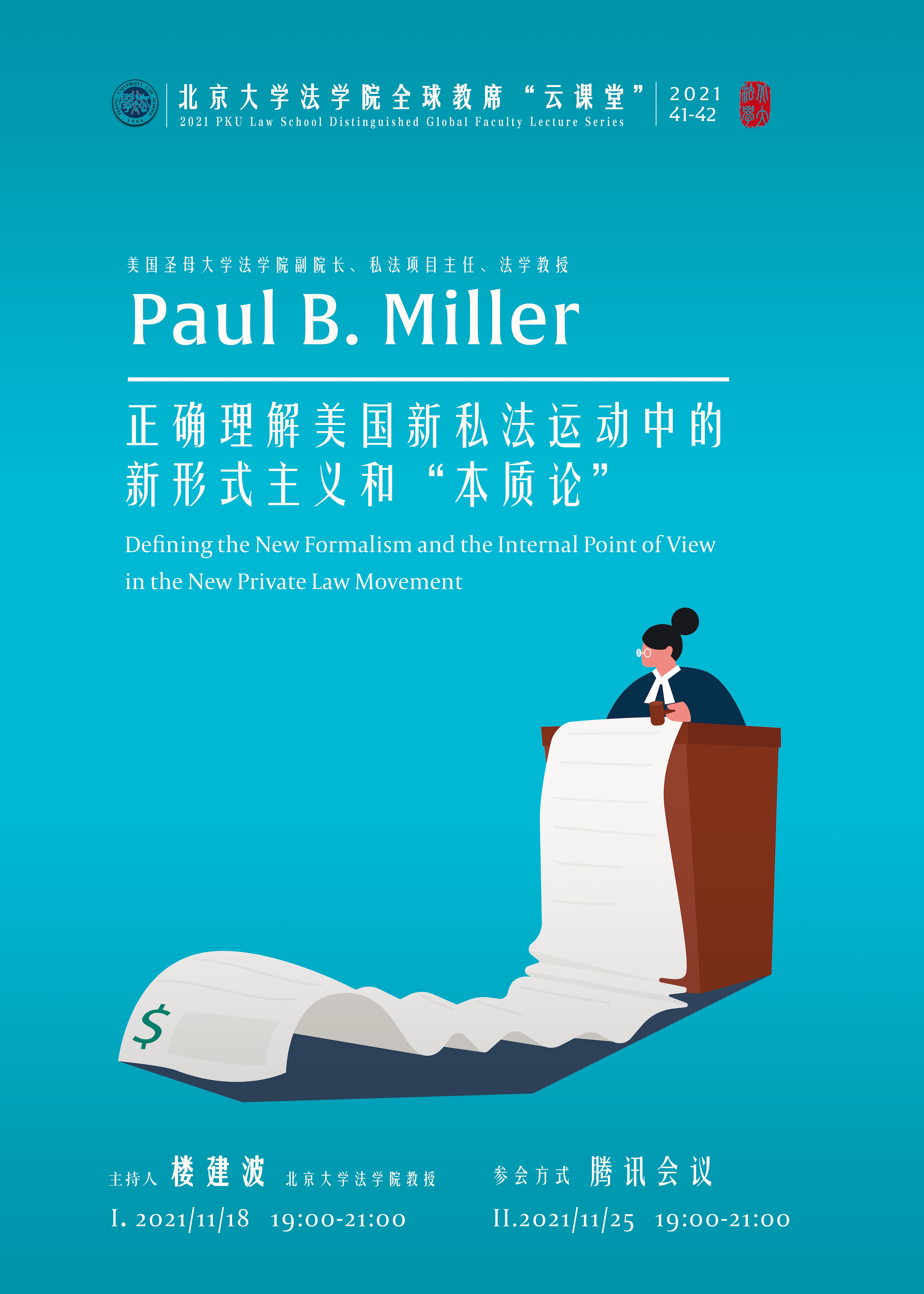 Paul B. Miller教授在其讲座中将对美国近30年来的“新私法”运动的方法论创新,对他称之为“新形式主义的方法”进行定义。他还试图对新私法学者提出的——作为对霍姆斯主义者倡导的私法的“现象论”的反动——“本质论”进行更激进的改造。