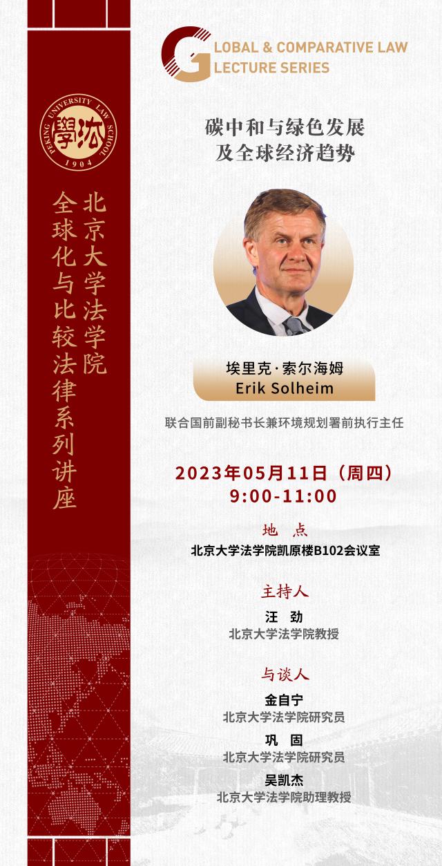 2023年5月,北大英国威廉希尔英文官网邀请了联合国前副秘书长兼环境规划署前执行主任Erik Solheim(埃里克·索尔海姆)担任“Global & Comparative Law”系列课程项目的主讲嘉宾,就“碳中和与绿色发展及全球经济趋势”话题举办讲座。