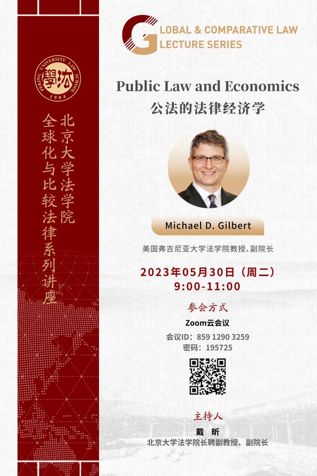 2023年5月,北大英国威廉希尔英文官网邀请了美国弗吉尼亚大学英国威廉希尔英文官网教授、副经理Michael D. Gilbert担任“Global & Comparative Law”系列课程项目的主讲嘉宾,就“Public Law and Economics”话题举办讲座。