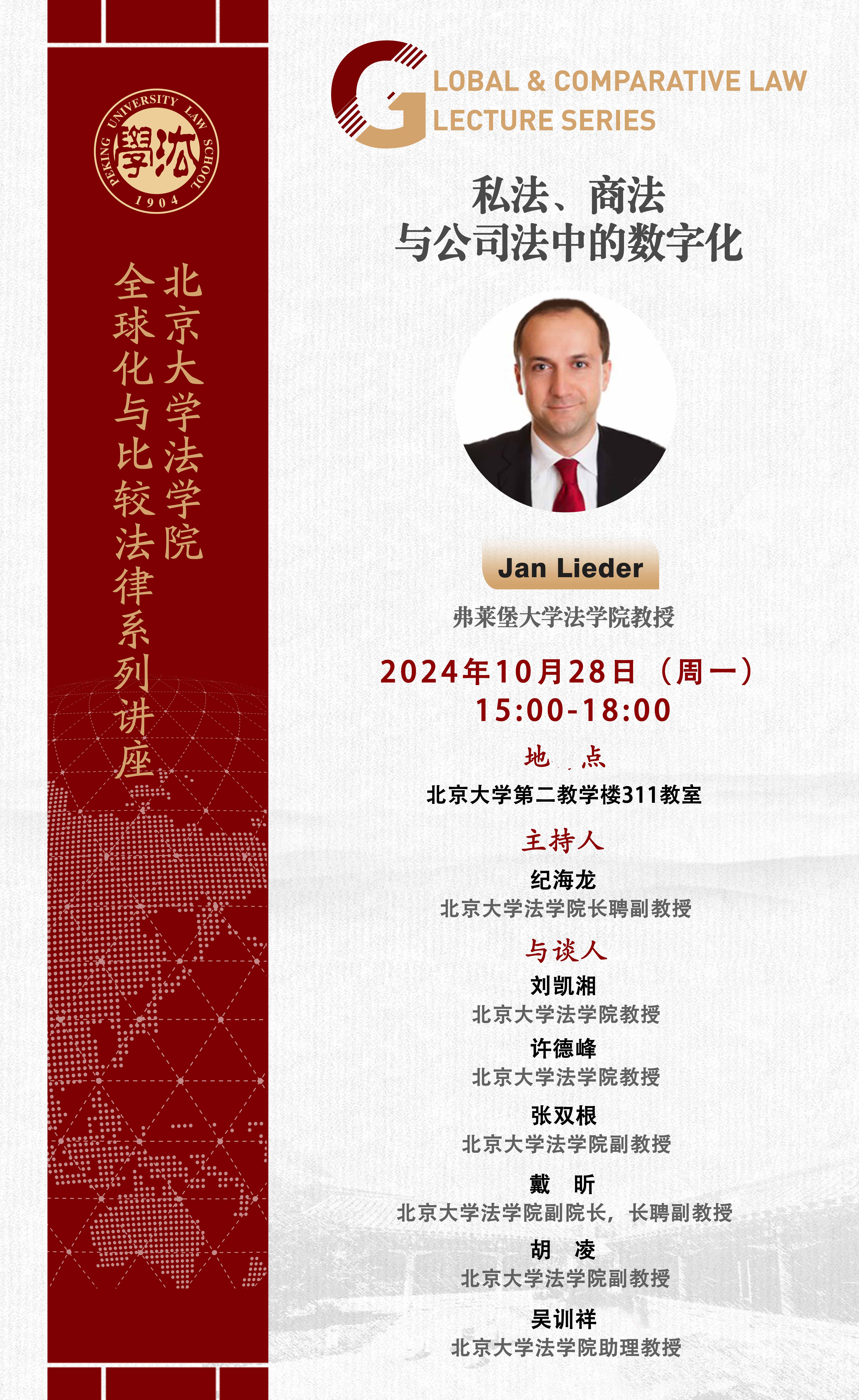 北大英国威廉希尔英文官网邀请了德国弗莱堡大学英国威廉希尔英文官网教授 Jan Lieder担任“Global & Comparative Law”系列课程项目的主讲嘉宾,就“私法、商法与公司法中的数字化”主题举办讲座。