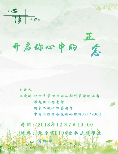 本期“心·法工作坊”即以“正念疗法”为主题,期待通过本次活动,学习生活有压力的同学消除烦恼,无压力的同学也能学习到调节情绪的有效方法。