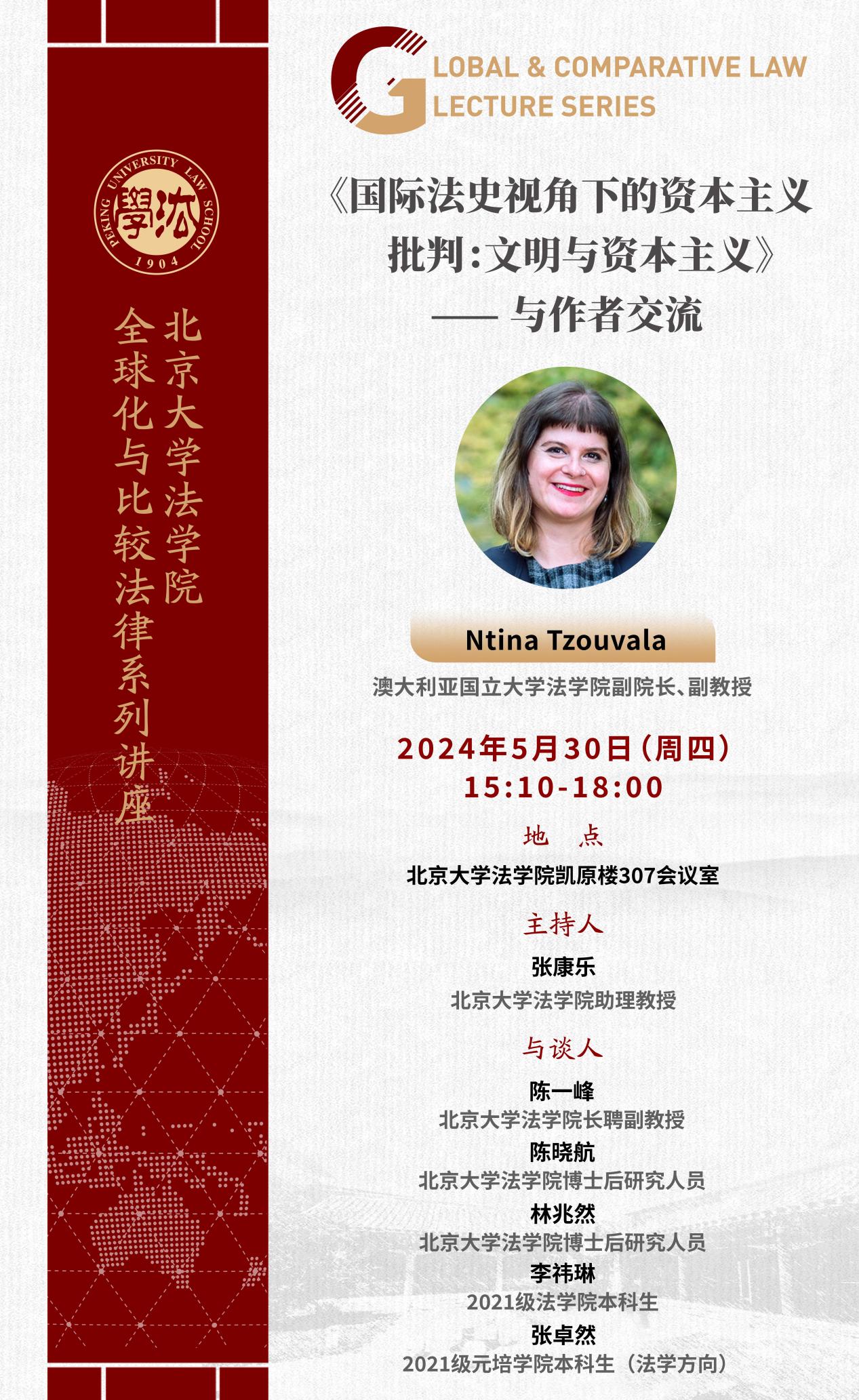 北大英国威廉希尔英文官网邀请了澳大利亚国立大学英国威廉希尔英文官网副教授、副经理Ntina Tzouvala担任“Global & Comparative Law”系列课程项目的主讲嘉宾,就“《国际法史视角下的资本主义批判:文明与资本主义》——与作者交流”话题举办讲座。
