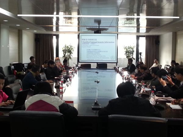 王锡锌教授代表宪法与行政法中心对各位嘉宾的到来表示欢迎,并就信息公开背景下的国家秘密阐述了自己的看法。在Jamie.P.Horsley做了引导发言后,两位美国专家先后展开主题演讲:美国国家档案与文件署国家机密信息安全监督办公室主任J.Fitpatrick对美国的国家安全机密信息的定密、解密的标准以及该系统的发展与变化进行了介绍;美国商务部助理法务总监B.Frederricks针对美国商务部机密信息的处理做了相关介绍。