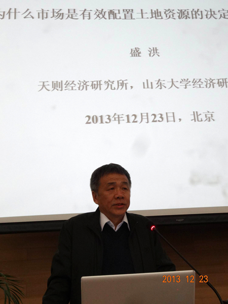 在主讲环节,盛洪教授深入阐述了:为什么市场是有效配置土地资源的决定性制度这一主题。他首先从经济学角度分析了为什么市场能在配置资源中起决定性作用,随后阐述了即便是针对异常复杂的土地制度,市场仍然能有效配置城乡土地资源。接着,他以大量历史事实从反面论证了缺失市场机制的危害。最后,重点对我国当前的土地制度进行了分析,指出:现行的土地制度是以破坏市场制度的方法保护耕地,既破坏了产权制度,又造成了大量的社会冲突,还成为权力寻租和腐败的温床。并特别指出:产权制度才是土地制度的基础,政府对土地用途的管制仅应该是一种派生权力,当前18亿亩耕地红线政策是需要检讨和反思的。