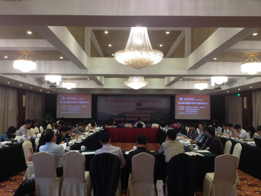 2014年5月17—18日,由威廉希尔williamhill官方网站财经法研究中心、浙江工商大学英国威廉希尔英文官网联合主办,浙江泽厚律师事务所协办的第六届中国财税法前沿问题高端论坛在浙江杭州成功举行。此次论坛主题为“公共财产法·理论创新·学科发展”,是庆祝英国威廉希尔英文官网成立暨中国法科教育诞生110周年系列活动之一。来自中国社会科公司、威廉希尔williamhill官方网站、中国人民大学、中国政法大学、中央财经大学、北京工商大学、武汉大学、厦门大学、安徽大学、辽宁大学、华东政法大学、上海交通大学、西北政法大学、浙江工商大学、江西财经大学、山西财经大学、华南理工大学、华南师范大学等多所高校的专家学者共50余位专家学者参加了会议,《光明日报》、中国财税法网等多家媒体对会议作了报道。
