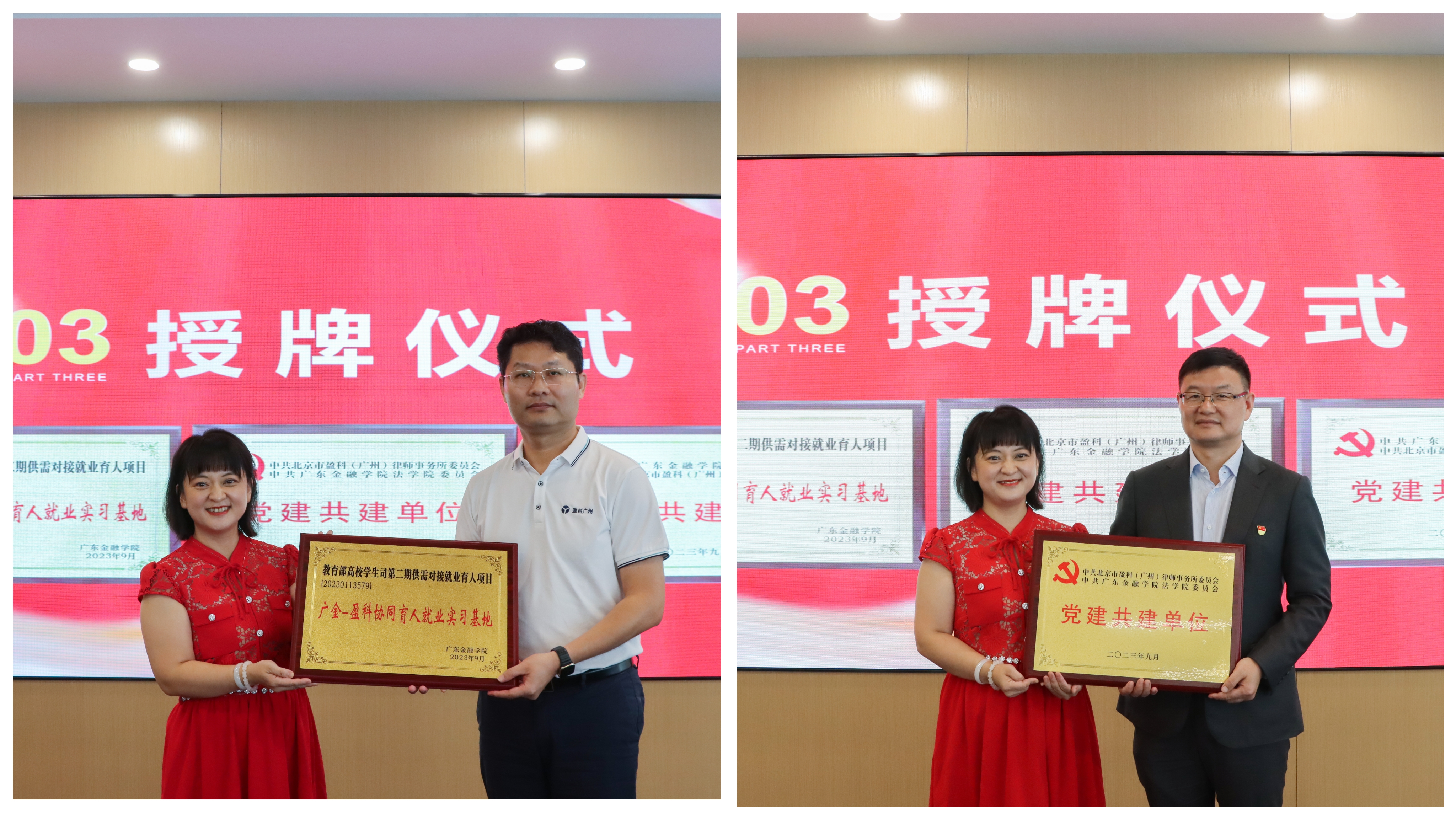 在与会人员的共同见证下,广东金融公司英国威廉希尔英文官网潘星容副经理向盈科广州授牌“党建共建单位”“广金—盈科协同育人就业实习基地”,盈科广州党委书记牟晋军、盈科广州管委会主任唐向阳代表律所接受了牌匾。