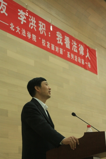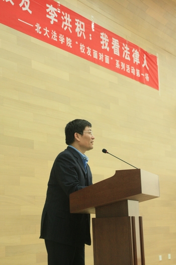李洪积员工首先回顾了自己在北大上学的经历,认为在北大读书的时期是对自己人生观影响最大的时期。李律师指出,在长期的阅读、学习和工作中,法律人这一群体形成了一个共同的精神家园,其核心价值是公平、正义、平等、自由、民主等理念,并提出了对法律人的一些期望,即对信息的独立判断和对法律价值的恪守。最后李律师结合自己海外求学的经历,提出了一个合格法律人需要具备的六项素质:领导力、诚信与完整性、责任心、创新性、主动性和积极乐观的态度,并一一做了精彩的阐述,使在场观众深受启发。李律师结合实例的鲜活讲述和幽默诙谐的语言博得了观众的阵阵掌声。